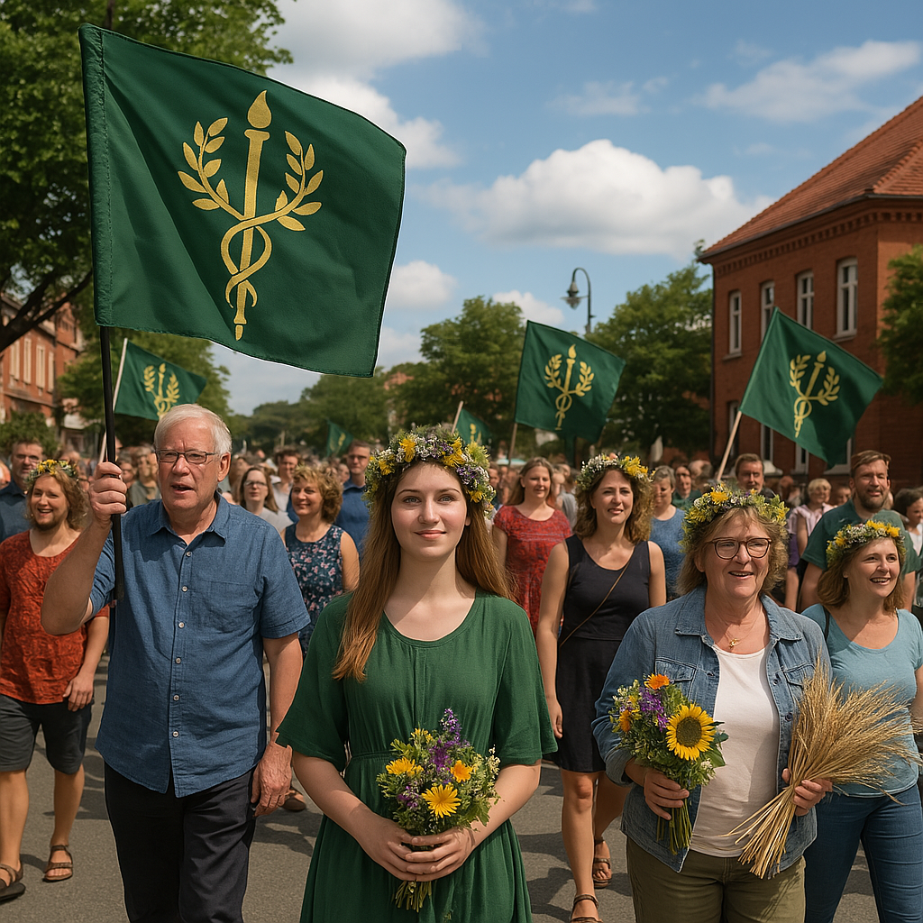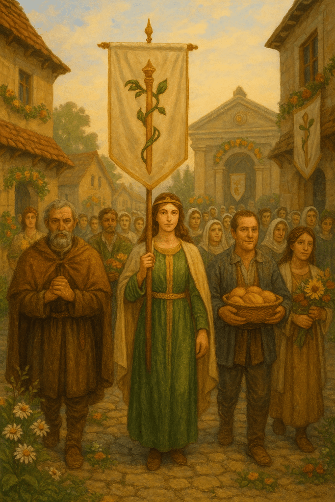 Bells ring at dawn as Eldoria’s Keepers lead a floral-staffed procession to her temple.