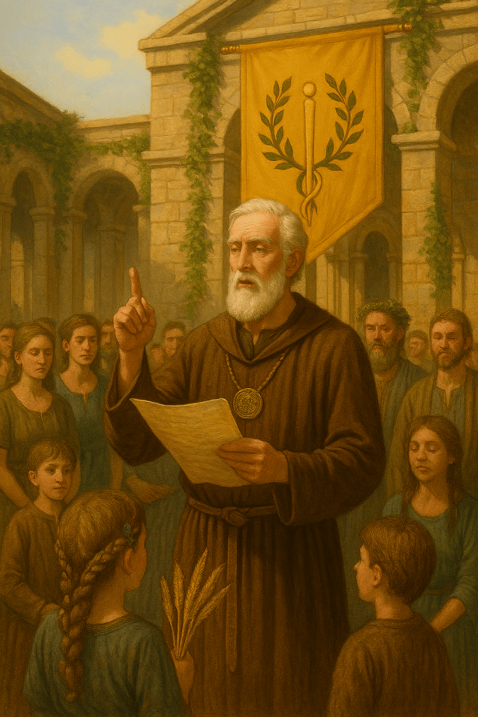Leaders and wise folk gather at sunrise to speak the Oath of Wisdom aloud, reaffirming their duty to lead fairly.