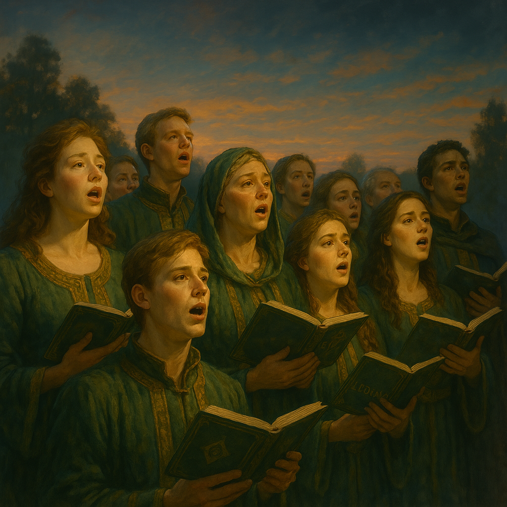 As dusk approaches, people gather once more at the temple, lighting lanterns of gold and green to symbolize the sun and the earth. These lanterns are sent floating down rivers or placed in the fields to watch over the crops, representing hope and continued prosperity. The final song, “Wisdom’s Light,” is sung as a chorus, carrying Eldoria’s blessings through the valley.