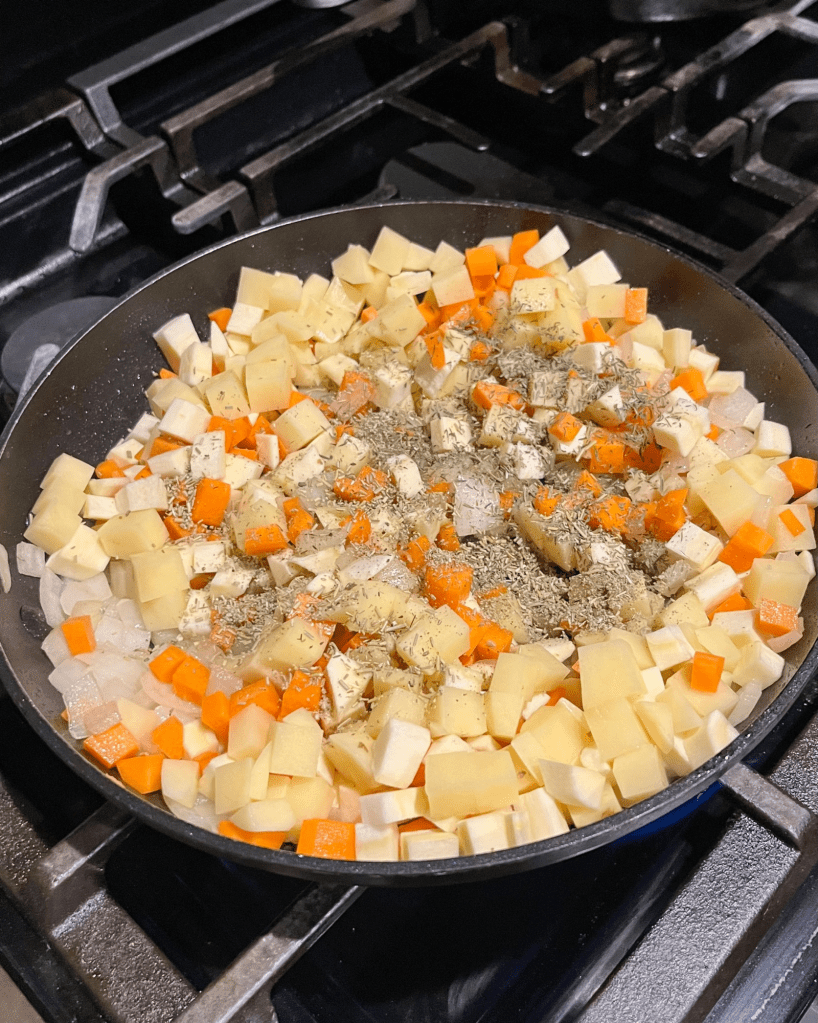 3. Add the root vegetables, herbs, salt, and pepper. Cook until softened (about 10 minutes).