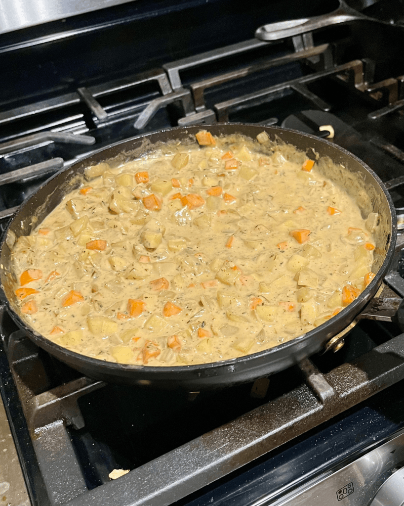 1. Stir in flour to coat the vegetables. Slowly add broth and cream, stirring until thickened.