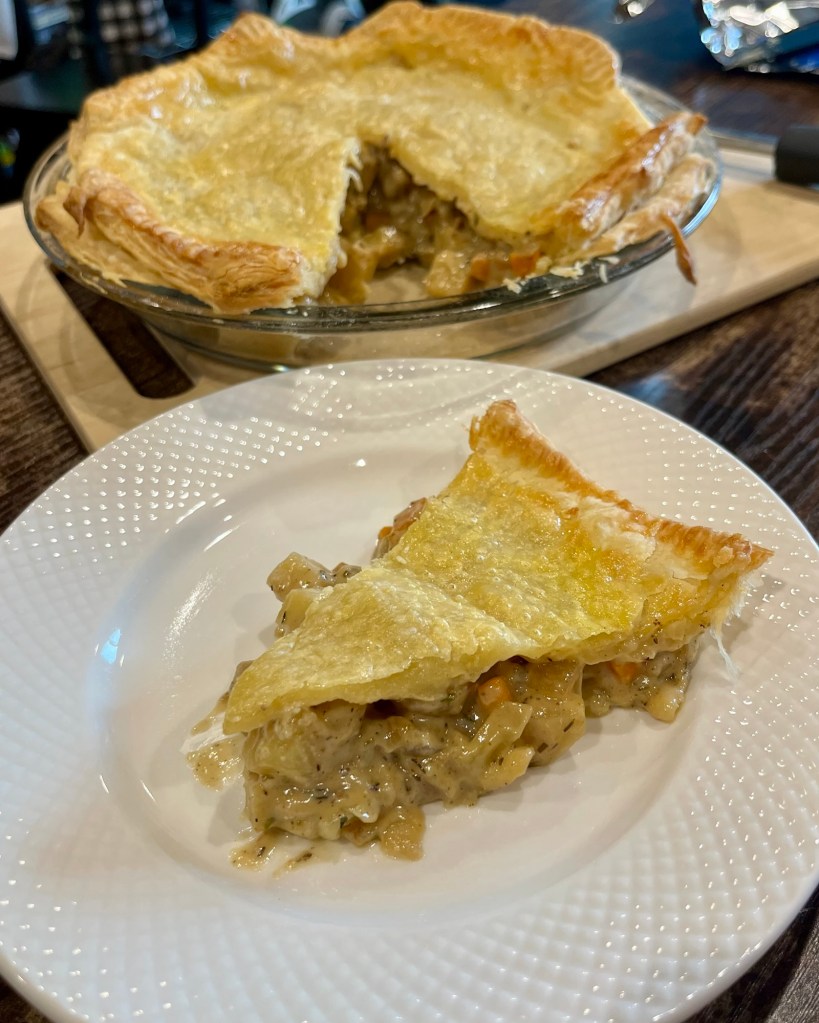 2. Roll out half of the puff pastry and place it in a pie dish. Pour in the filling.