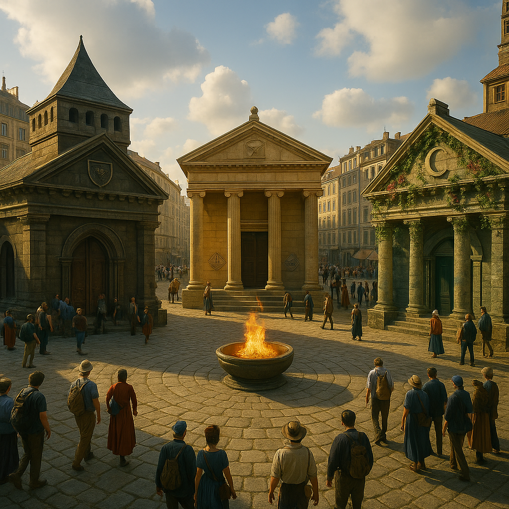 Temple District – A sacred square where all four gods of Harmonium are honored. At its center: the Eternal Flame. Always lit. Always watching.
