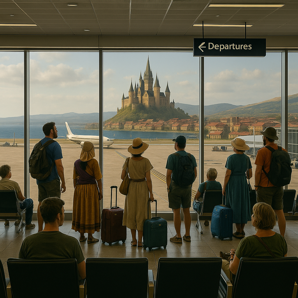 Glanvaria International Airport – The modern edge of a timeless kingdom. Clean glass. Enchanted signs. Just don’t ask about travel delays during Yak Mating Season-not even airport staff are prepared to respond.